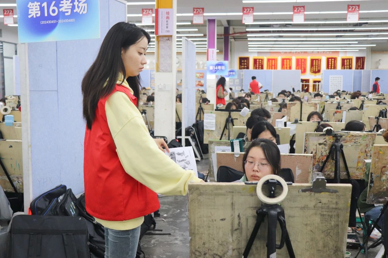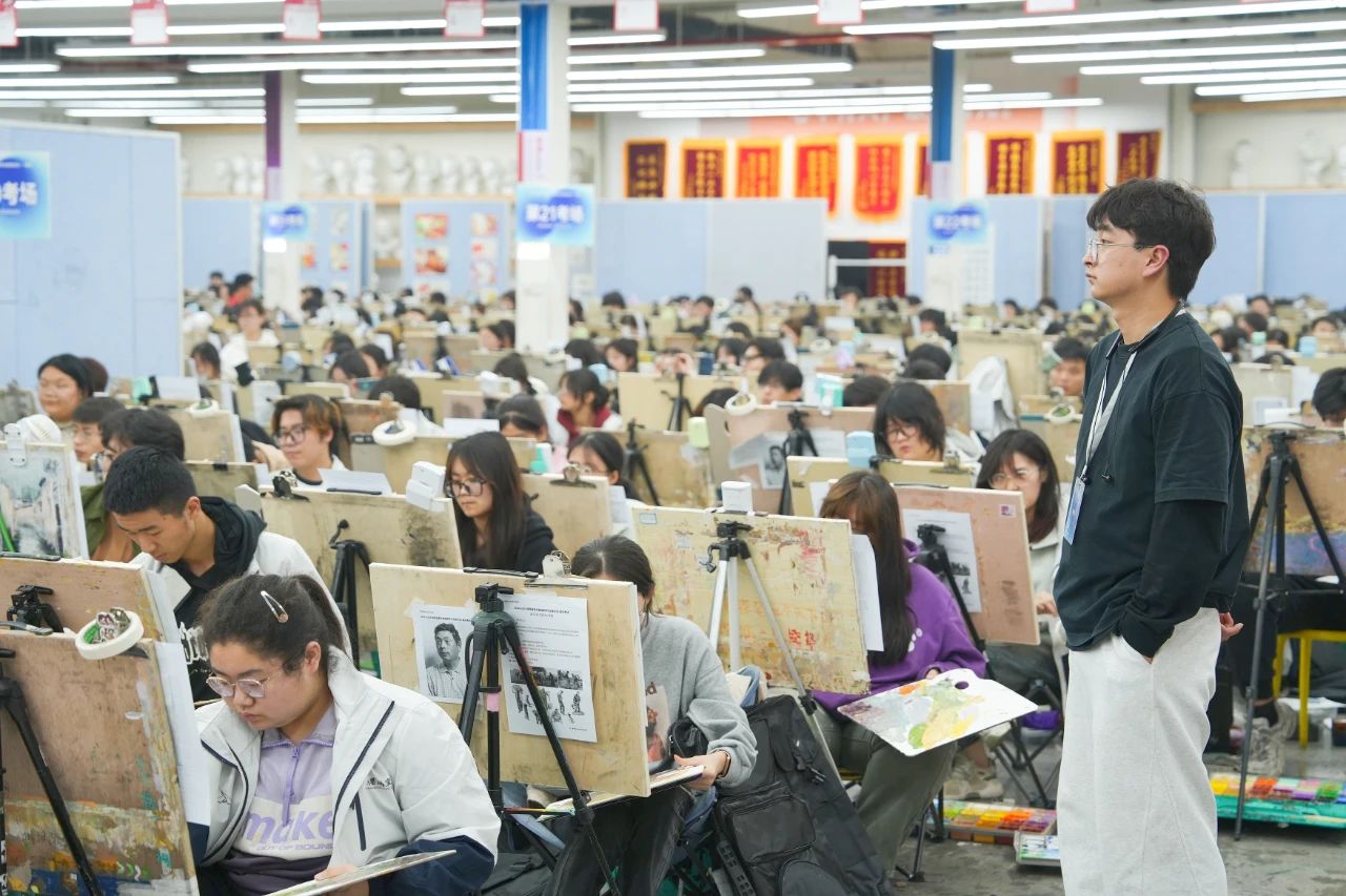 考场上,考生们从容应对,有条不紊地分步骤作画,紧张而又专注地端详着,笔尖在纸面上舞动,奋力描绘着自己心中的答案。紧张而不慌张,稳进而不大意,稳中求快是他们做答的主旋律。考场里响起画笔与画纸的摩挲声,仿佛早就昭示了考生们平日刻苦沉淀的自信。